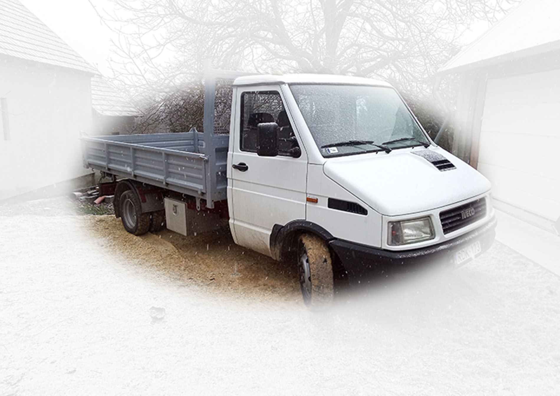 3,5 tonnás össztömegű kisteherautóval, aminek platója 350 cm hosszú és 210 centiméter széles és 3 oldalra billent.